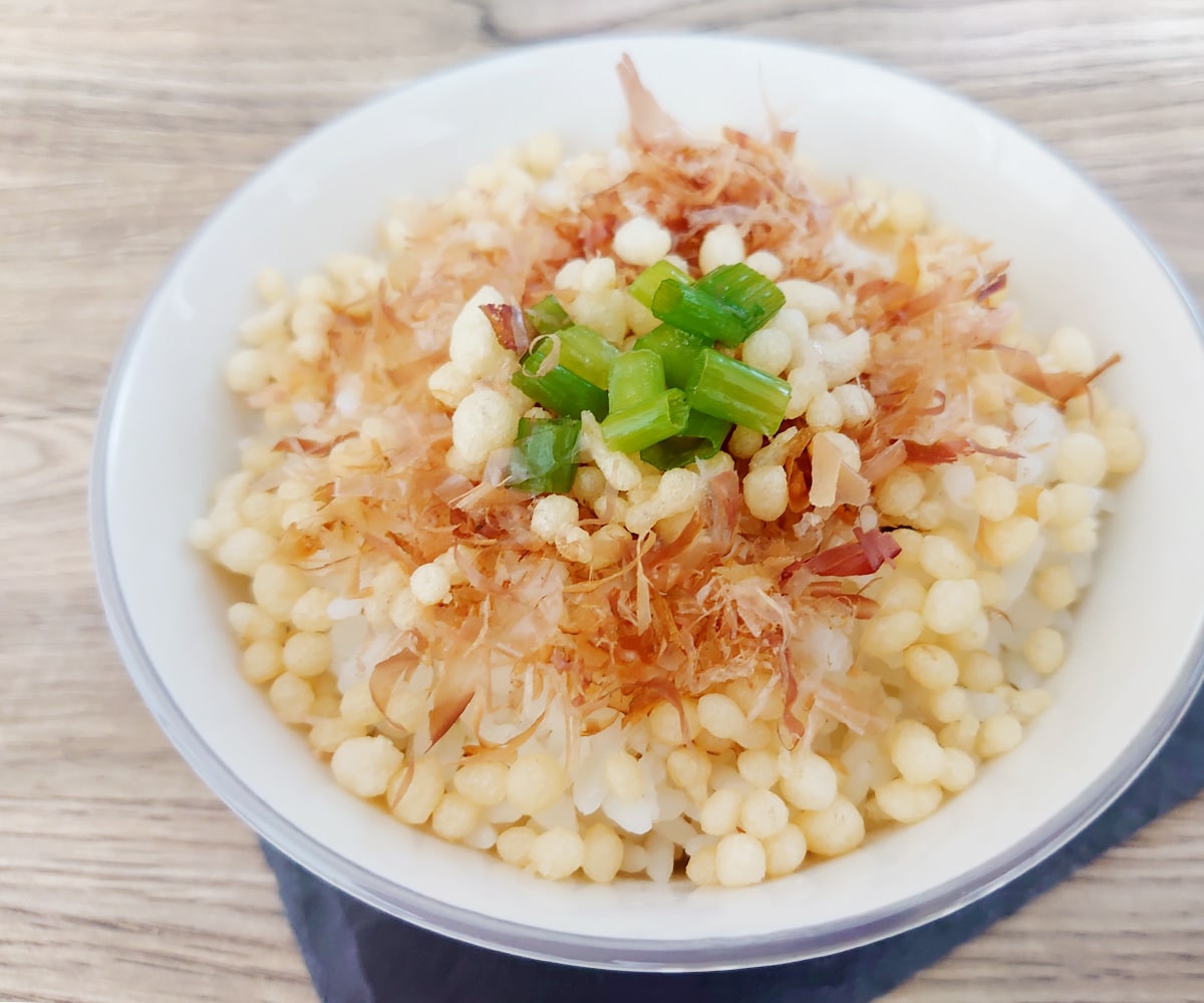 - ご飯 茶碗1杯 かつお節 適量 はんぺん 1/4 小ネギ 小口切り適量 スイートチリソース 適量