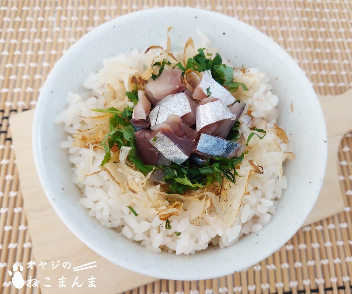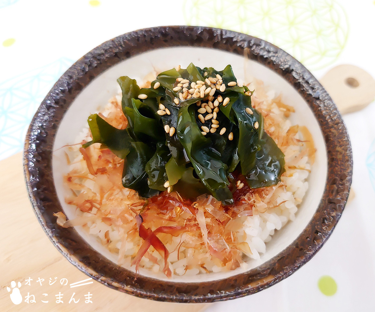 茶碗(丼)にご飯を盛って、かつお節をのせる。